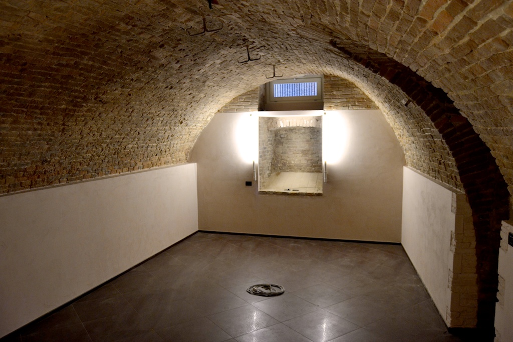 interno in calce panna-rosato e mattoni a vista
